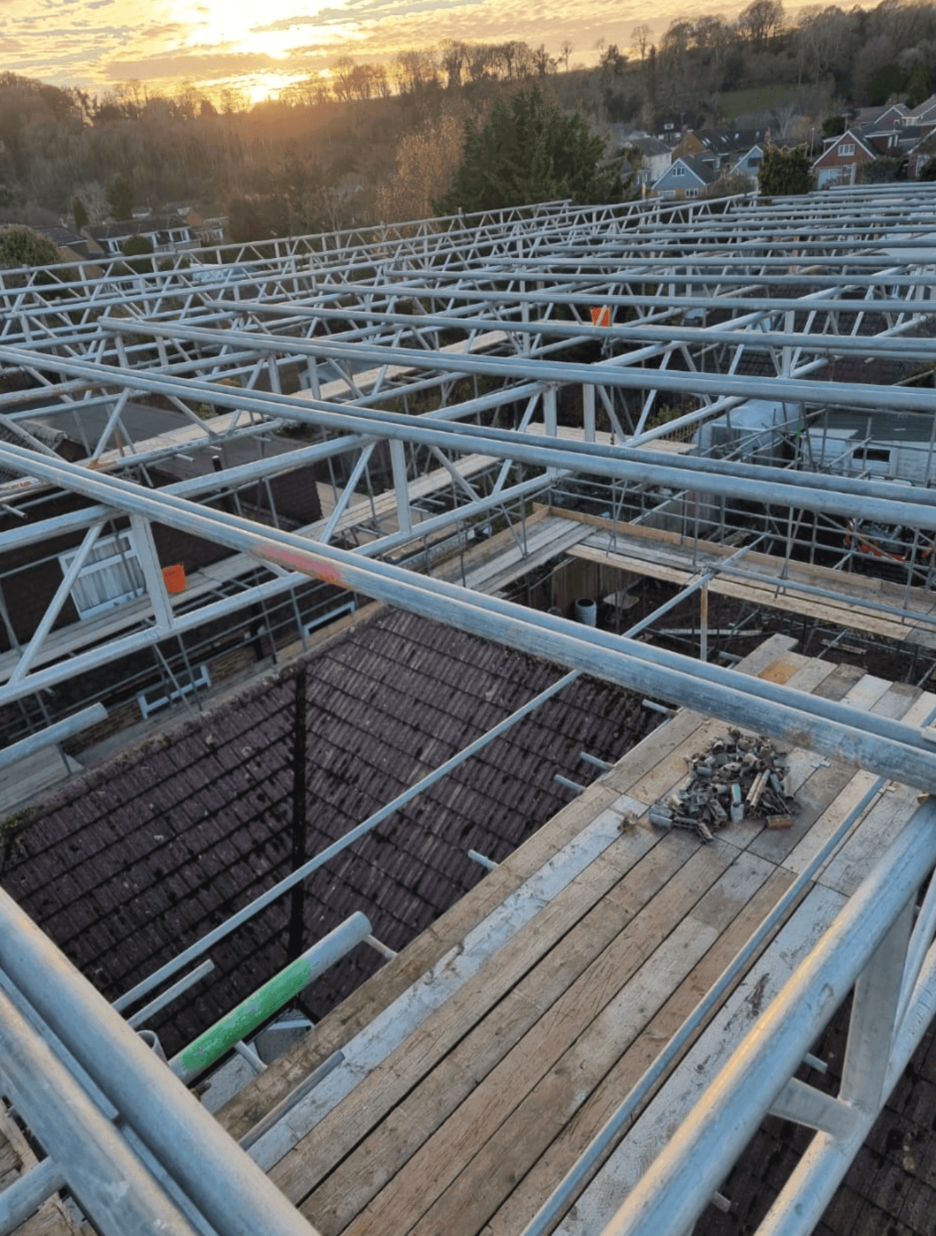 A system roof structure typically combines lightweight aluminium beams with a weather-resistant covering such as shrink wrap or corrugated sheeting. This creates a strong, watertight enclosure that allows work to continue safely and efficiently throughout roofing, restoration, or refurbishment projects.